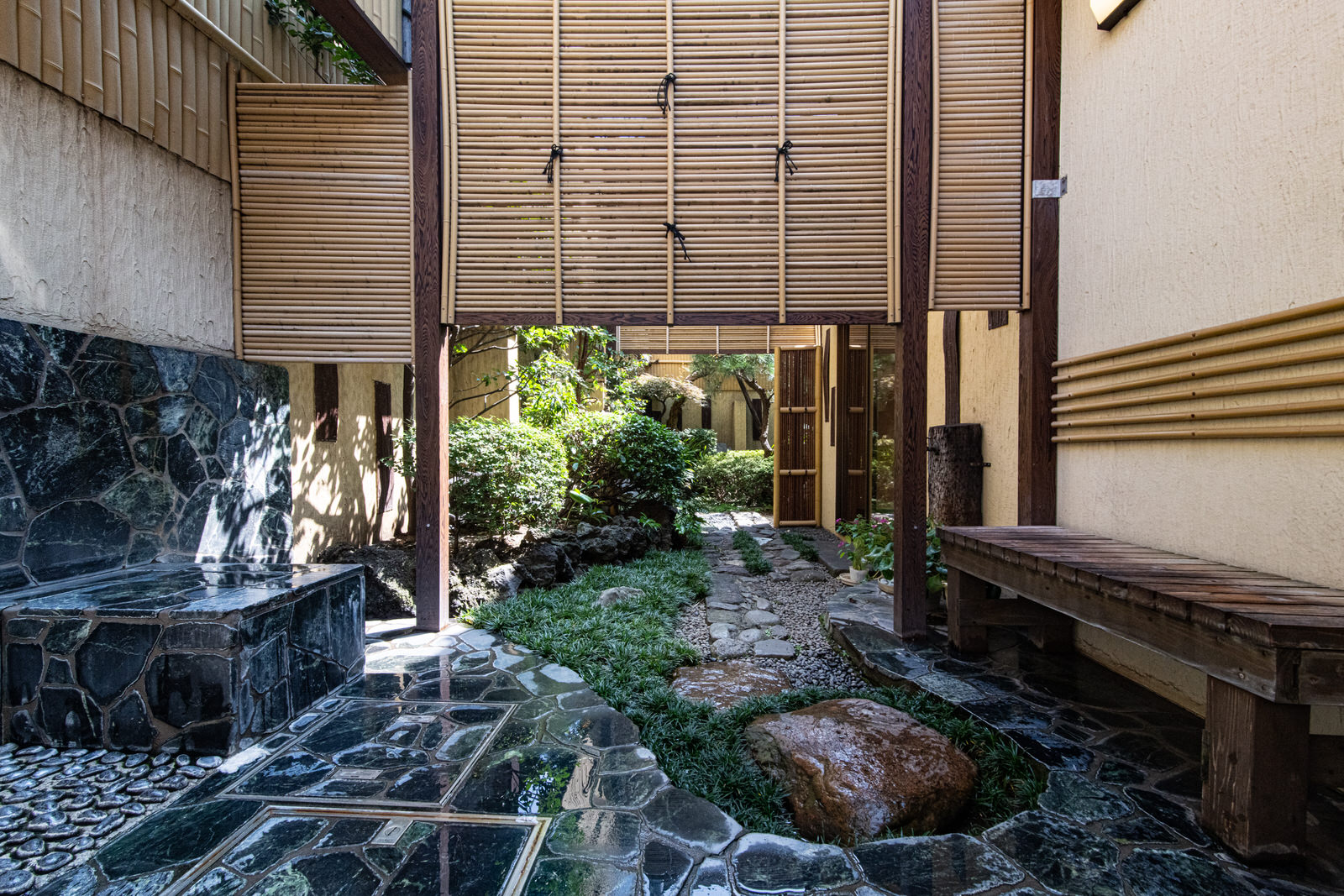 日本庭園を見ながら入る露天風呂。日々の喧騒を忘れ、旅行に行ったかのような贅沢な時間を過ごせます。